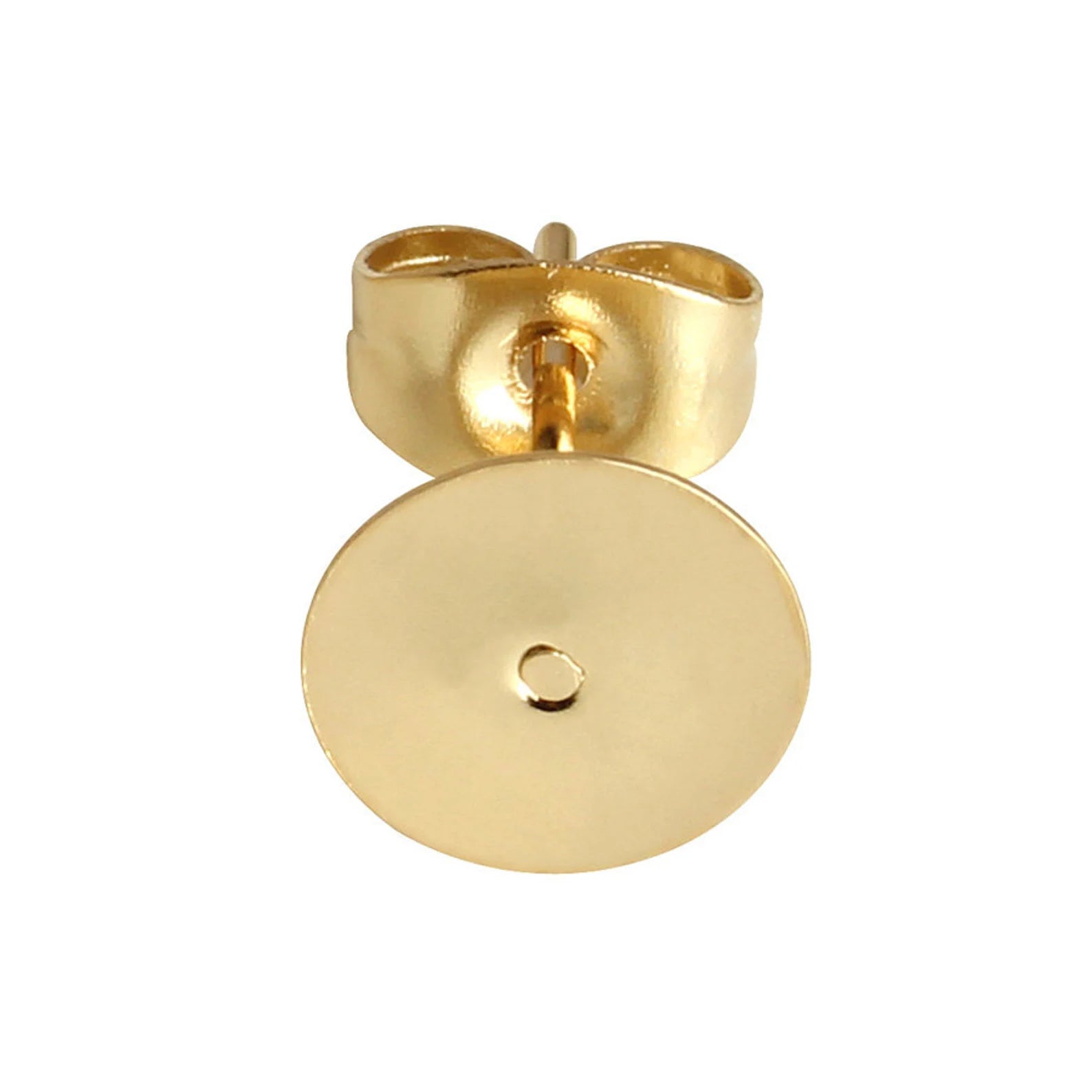 50Pcs Gold Flat Earring Studs – the perfect base for all your DIY jewelry making projects. These 8mm flat pad earring posts are crafted from high-quality metal with a shiny gold finish, ideal for gluing on cabochons, resin art, clay designs, or beads.