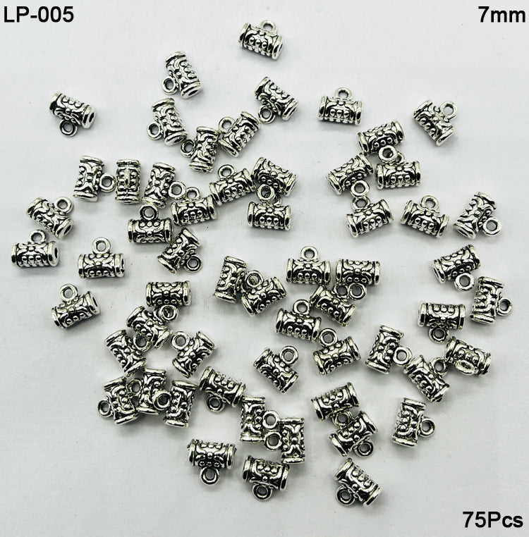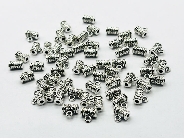 75Pcs 7mm Antique Silver Pendant Bails (LP-005). Designed in a unique barrel style with fine detailing, these connector beads are perfect for attaching pendants, charms, or focal pieces to necklaces, bracelets, and earrings.