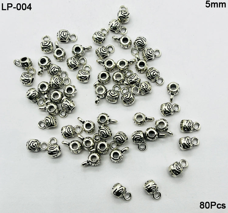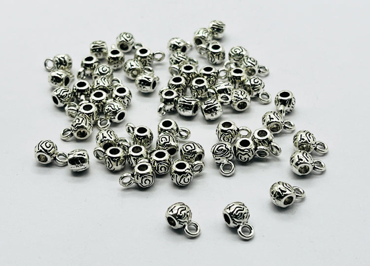 80Pcs 5mm Antique Silver Pendant Bails (LP-004). Designed with a decorative round shape and carved swirl texture, these connector beads are perfect for attaching pendants, charms, and beads to necklaces, bracelets, anklets, and earrings.
