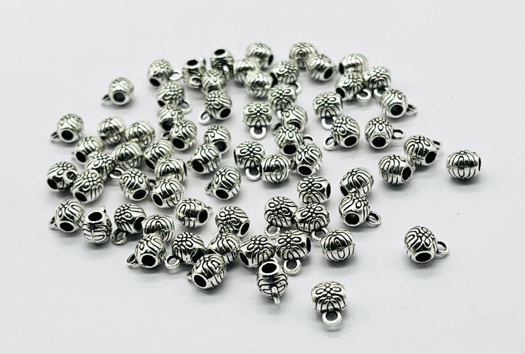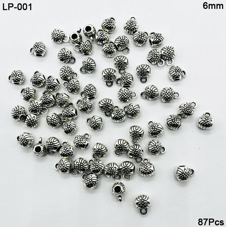 87-piece set of 6mm Antique Silver Bead Loops (LP-001). Crafted from high-quality metal with an intricate floral pattern, these decorative spacer charms are perfect for necklaces, bracelets, anklets, and other DIY jewelry projects. Each bead features a built-in loop, making them easy to attach to wires, threads, or chains.
