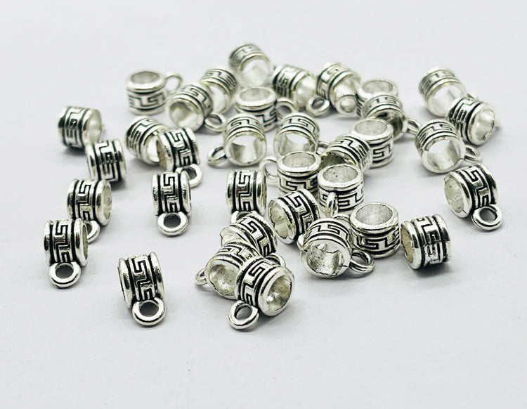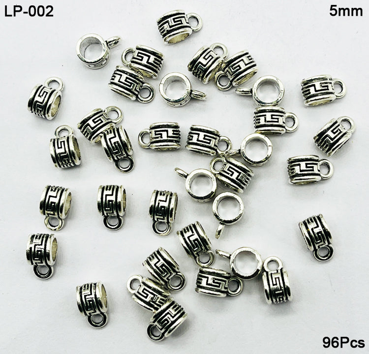 96-piece set of 5mm Antique Silver Pendant Bails – LP-002. Each bail features a classic Greek key pattern and a sturdy loop, perfect for attaching pendants, charms, or beads to your necklaces, bracelets, and earrings.