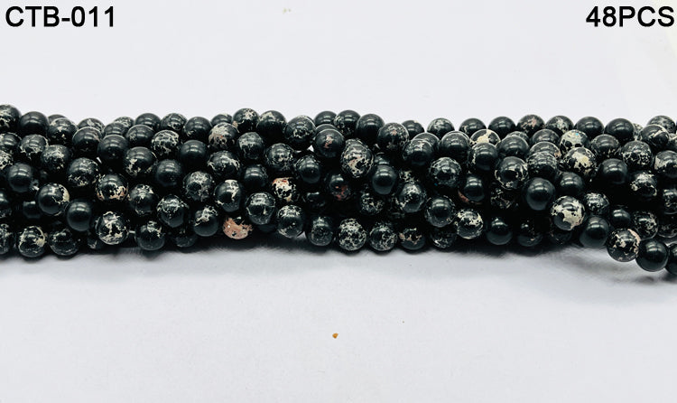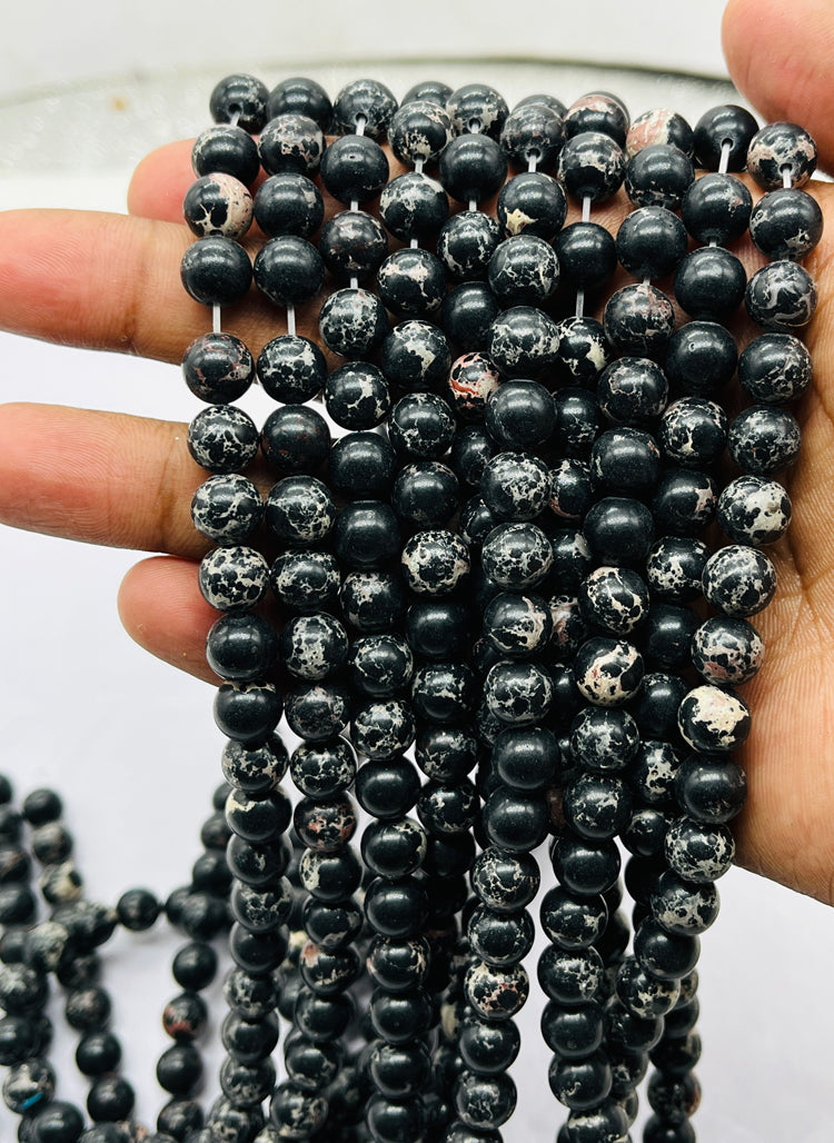Beadwaala Natural Black Copper Turquoise Gemstone Beads. This premium 48-piece set of 8mm round plain beads is crafted from genuine black copper turquoise, showcasing deep black tones with stunning copper matrix patterns for a luxurious, one-of-a-kind look.