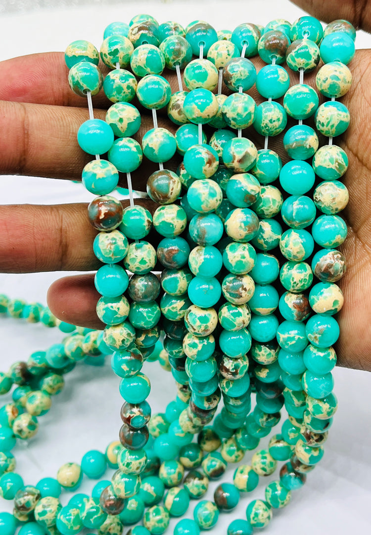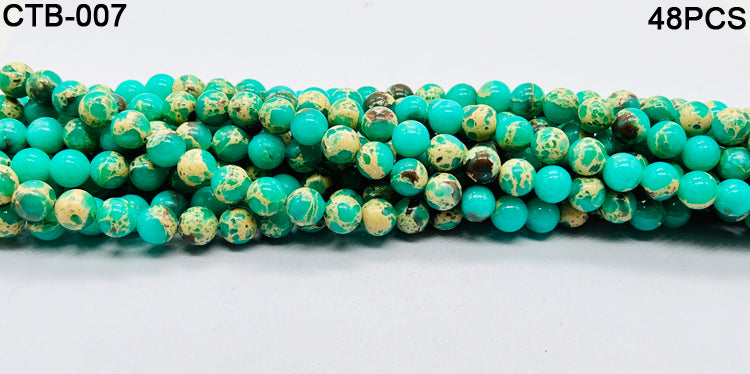 Natural Light Green Copper Turquoise Gemstone 8mm Round Beads. This 48-piece set features smooth, polished round beads, each showcasing the unique green hues and copper matrix that make turquoise so desirable.