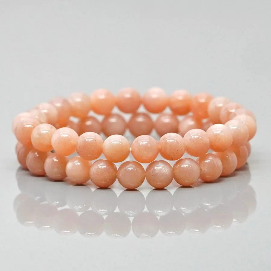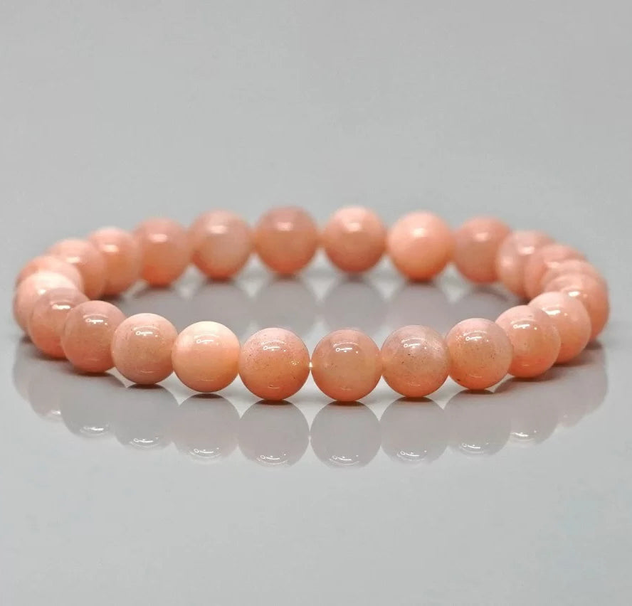 This Natural Peach Moonstone 8mm Smooth Round AA Grade Gemstone Beads Stretch Bracelet features soft peach tones with a gentle, luminous sheen. Smoothly polished and set on a durable stretch cord, it offers a comfortable fit and an elegant, delicate look perfect for everyday wear or special occasions.